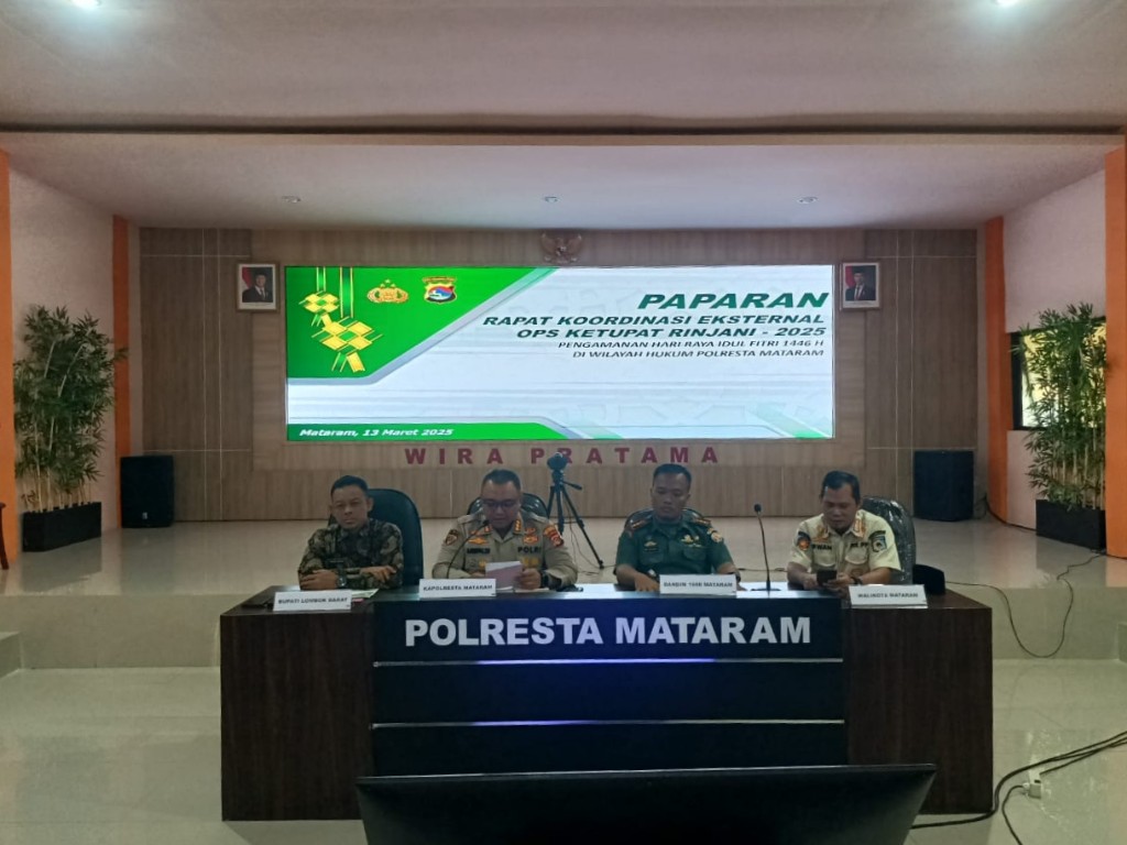 Mataram, NTB – Menjelang perayaan Idul Fitri 1446 H, Kepolisian Resort Kota (Polresta) Mataram menggelar rapat koordinasi lintas sektoral bidang operasional guna memastikan kesiapan pengamanan di Gedung Graha Wira Pratama Polres Mataram ini dipimpin langsung oleh Kapolresta Mataram, Kombes Pol. Dr. Ariefaldi Warganegara, S.H., S.I.K., M.M., CPHR., CBA., CHRM., dan diikuti oleh Komandan Kodim (Dandim) 1606/Mataram, Kolonel Arm Muhammad Saifudin Khoiruzzamani S.sos., M.Han., Walikota Mataram yang diwakili oleh Kasat Pol PP Kota Mataram, Irwan Rahardi, Bupati Lobar yang diwakili oleh Asisten 1 Bidang Pemerintahan H. Fauzan Husniadi., dan ±80 peserta, baik secara langsung maupun daring, Kamis (13/3/2025).