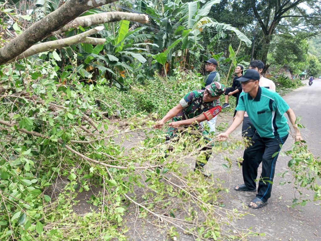 Dengan semangat gotong royong, mereka membersihkan material pohon yang menghalangi akses jalan dan memastikan situasi kembali aman bagi warga sekitar.