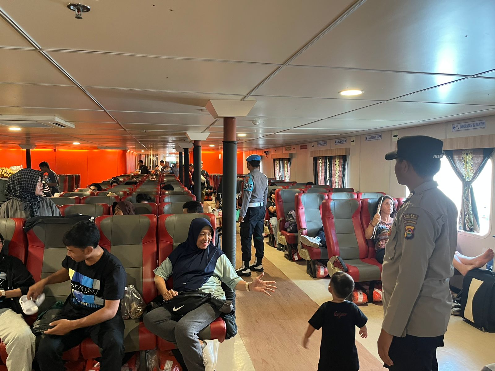 Personel kepolisian juga melaksanakan patroli di atas kapal yang sedang berlayar. Langkah proaktif ini bertujuan untuk memantau situasi di dalam kapal, mencegah terjadinya tindak kriminalitas, serta memberikan pelayanan dan perlindungan kepada para penumpang selama perjalanan.