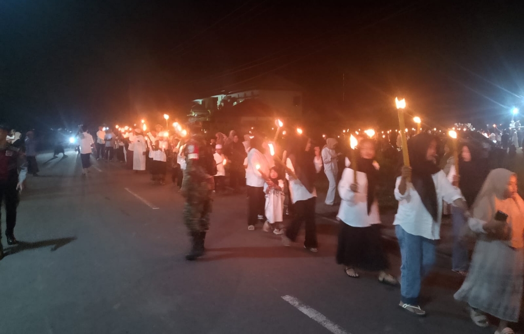 Suasana religius dan penuh semangat tampak mengiringi langkah para peserta yang membawa obor menyala, simbol cahaya iman dan harapan menyongsong tahun baru Hijriah.